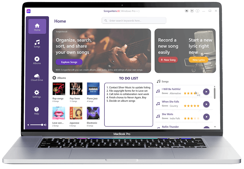 Everything you need to write, organize, and find your songs – all in one powerful desktop app. SongwritersdB brings together the essential tools that help you focus on creating, not searching.