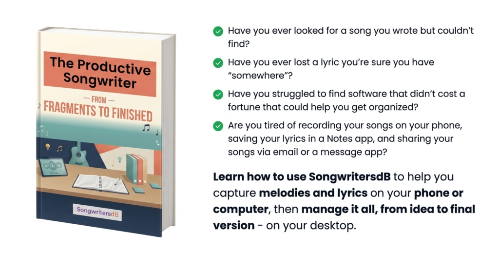 The SongwritersdB Aux mobile app, available for iPhone and Android, lets you record ideas and jot down lyrics while on the go. Everything you save in the mobile app is synced to the cloud, so you can seamlessly pick up where you left off on the desktop version of SongwritersdB.