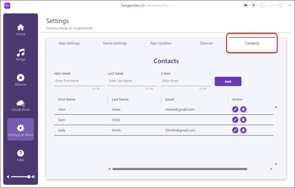 When you enter a name into Sharing, Sessions, and Co-writers, their names and—if applicable—email addresses are saved in the Contacts page.