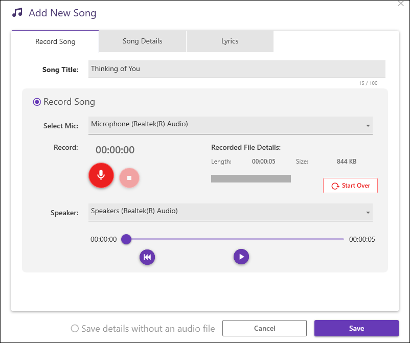 - Titles: To add just a title idea, replace the default date in the Song Title field and click “Save details without an audio file” and then Save. Now you will have a blank song tile with just a new title. Another option is to save a song named “Title ideas” and add your new title ideas to the Lyrics page of this song; the first time you do this, you will need to click “Save details without an audio file.”
